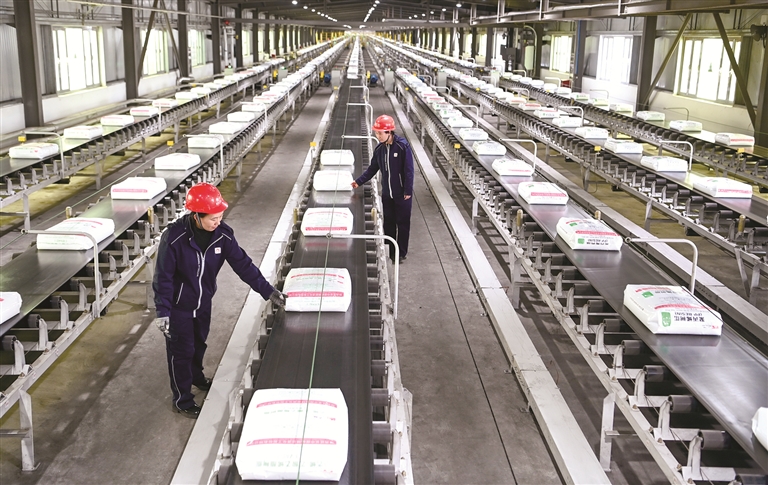 位于陕西省榆林市靖边县的陕西延长中煤榆林能源化工股份有限公司,2023年聚烯烃产量首次突破200万吨,成为陕西规模最大、国内单厂领先的聚烯烃供应商。图为陕西延长中煤榆林能源化工股份有限公司聚烯烃产品包装线。图片来源:视觉中国