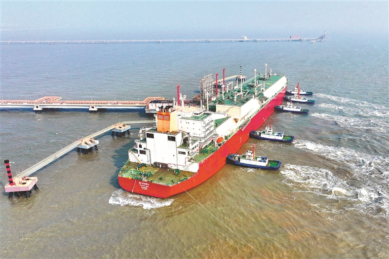 习近平总书记在省部级主要领导干部学习贯彻党的二十届三中全会精神专题研讨班开班式上的重要讲话,激励广大干部群众鼓足干劲、勇毅前行,推动各项改革举措精准落地见效,奋力打开改革发展新天地。图为近日,国家石油天然气基础设施建设重点工程中国石油唐山LNG(液化天然气)接收站正进行LNG运输船停靠。新华社记者 杨世尧 摄