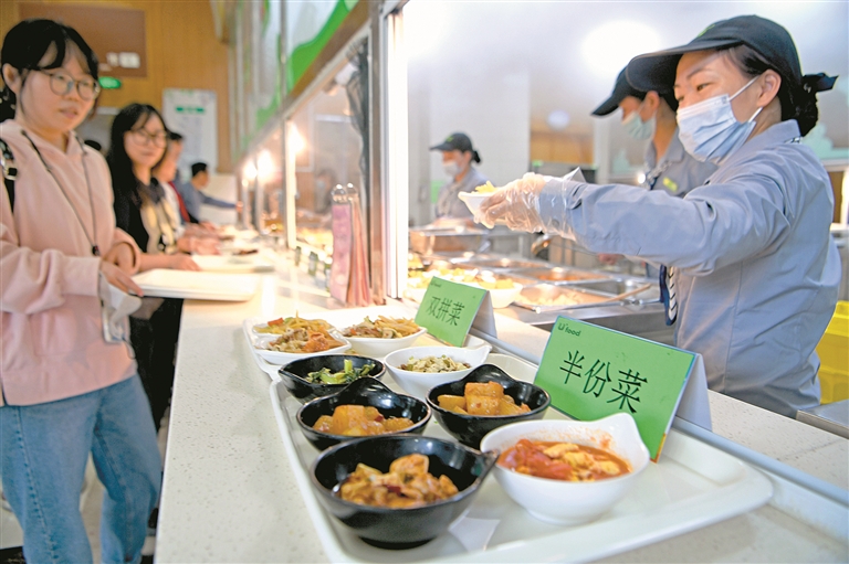 安徽省淮南市机关食堂推出双拼菜、半份菜、自助餐称重菜等就餐形式,倡导“光盘行动”,珍惜每一餐饭,节约每一粒粮。图片来源:视觉中国