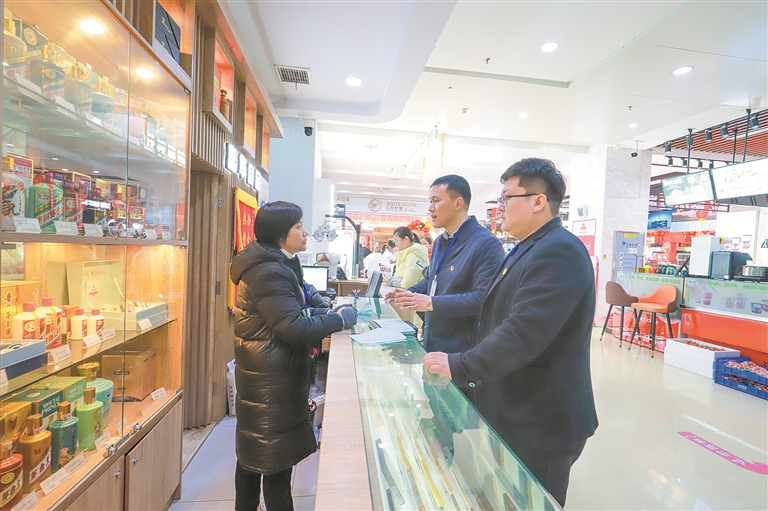 连日来,江苏省东海县纪委监委联合县作风办等部门组建专项督查组,深入辖区商超、土特产店以及机关企事业单位,对违规收送礼品礼金等节日期间易发多发“四风”问题开展专项监督,确保风清气正过节。图为专项督查组在当地一超市走访了解有关情况。徐丽 摄