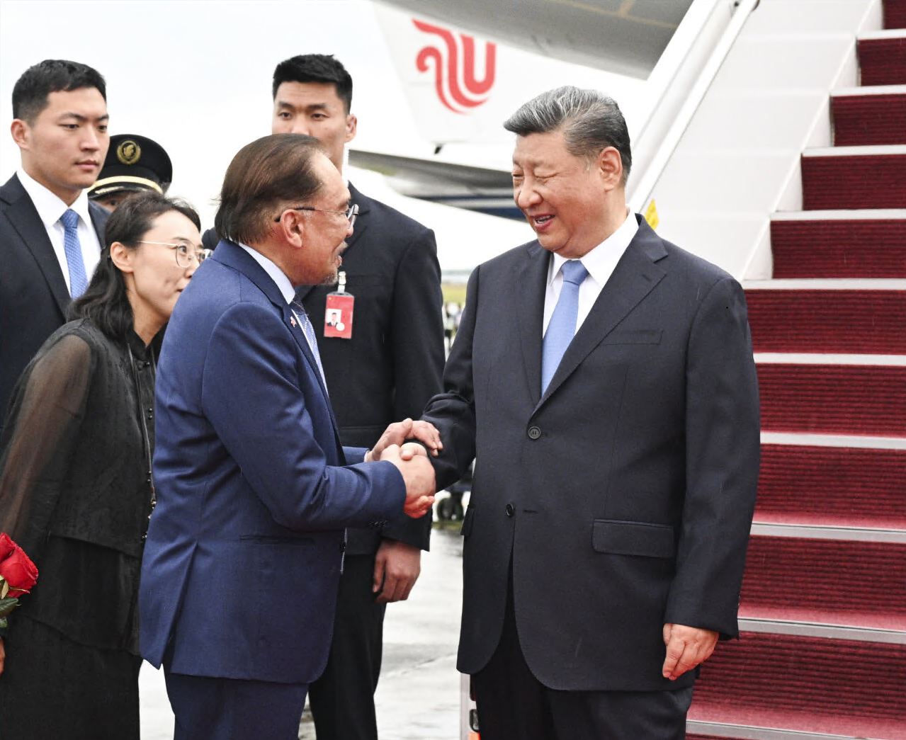 专机抵达吉隆坡国际机场时,马来西亚总理安瓦尔,外交部部长穆罕默德,陪同部长、交通部部长陆兆福等高级官员热情迎接。马来西亚儿童向习近平献花,马来西亚青少年表演富有当地特色的舞蹈,挥舞中马两国国旗,热烈欢迎习近平到访。