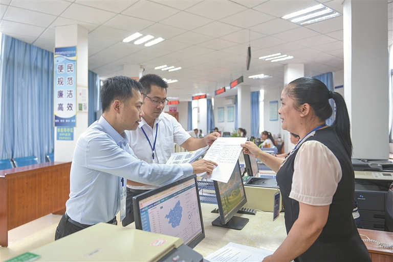 广西壮族自治区岑溪市纪委监委紧盯企业、群众办事难点、堵点、痛点,组织纪检监察干部深入政务服务窗口靠前监督,摸排违规审批、滥设门槛等问题线索,助力营商环境持续优化。图为近日,该市纪检监察干部在政务服务中心开展监督检查。 曾靖夏 摄