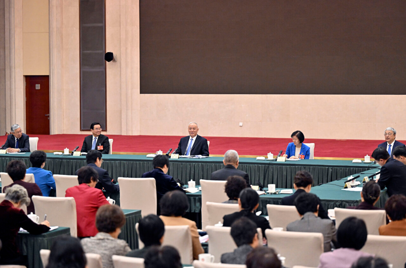 3月6日上午,中共中央政治局常委、全国政协主席王沪宁参加全国政协十四届四次会议文化艺术、体育界委员联组会。 新华社记者 王晔 摄