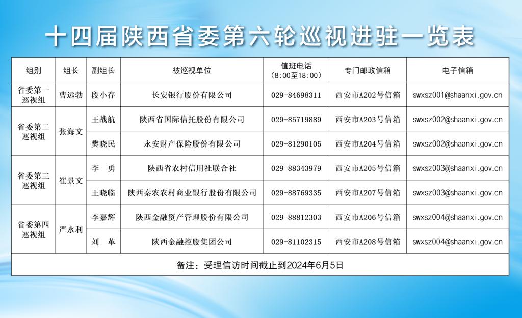 经省委批准,4个巡视组将对陕西省农村信用社联合社、长安银行股份有限公司、陕西秦农农村商业银行股份有限公司、陕西金融资产管理股份有限公司、陕西省国际信托股份有限公司、陕西金融控股集团有限公司、永安财产保险股份有限公司等7家省管金融单位党委开展常规巡视。