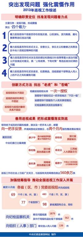 依靠这些灵活机动、针对性强的巡视方法,2013年,10个中央巡视组先后分两轮对20个地方、部门和企事业单位展开巡视,发现了被巡视党组织在“四个着力”方面存在的一些突出问题,特别是一些领导干部涉嫌违纪违法问题线索,其中有价值的线索比过去增加了5倍。