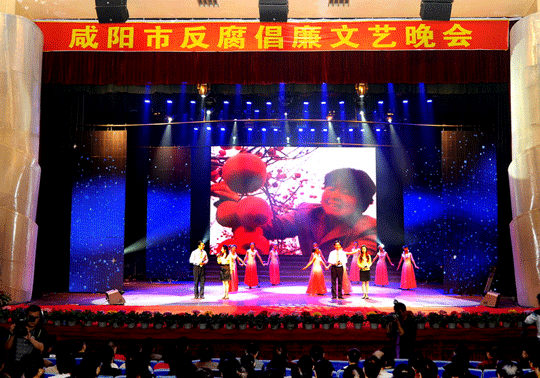 随着旷远凝重的钟声响起,于右任草书文天祥的《正气歌》跃然出现在天幕之上,由此拉开了晚会的帷幕。一曲歌伴舞《唱响正气歌》,迎得了观众的阵阵掌声。高举鲜红党旗,铁肩担道义,诗朗诵《心中的丰碑》将乾县石牛乡何家塬村原党支部书记肖宏斌一心为民的典型事迹展示在观众的面前。构建和谐情似火,牢记《准则》铸铜墙,音乐舞蹈快板《廉政花开结硕果》反映了咸阳市狠抓反腐倡廉建设,纪检监察工作为全市经济社会又好又快发展做出了巨大贡献。反腐倡廉几道关,首先面对是金钱,小品《生日蛋糕》折射出有人为了私利设法拿钱开路,执法人员面对诱惑,坚守原则,公正执法。歌伴舞《可爱的咸阳》展现了廉政建设深入人心,咸阳大地一派欣欣向荣。三句半《为警清廉促发展》展现了公安干警坚持服务发展、促进发展,为构建和谐咸阳做出的巨大努力。音乐情景诗话《清风和韵》、小品《醉了醒了》、领袖寄语《警钟长鸣》引起观众的沉思。为了人民,激扬正气,历练青松品节,永葆丹心,歌伴舞《红梅赞》、腰鼓舞《战鼓催征》将整台晚会推向了高潮。