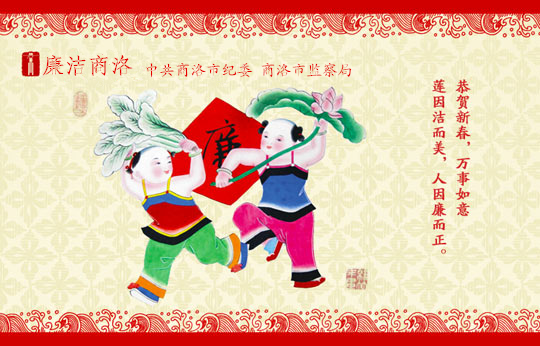 1月5日,陕西省商洛市纪委在全省推出首个纪委电子廉政贺年卡。当日,包含了“户户悬鱼”、“廉年有余”、“清正廉洁”内容的三幅精美图文电子贺年卡在“陕西省十佳纪检监察互联网站——“商洛纪检监察网”正式亮相。这是该市以实际行动落实中纪委《关于严禁公款购买印制寄送贺年卡等物品的通知》精神,倡导廉洁过节理念,弘扬新风正气推出的的新举措。