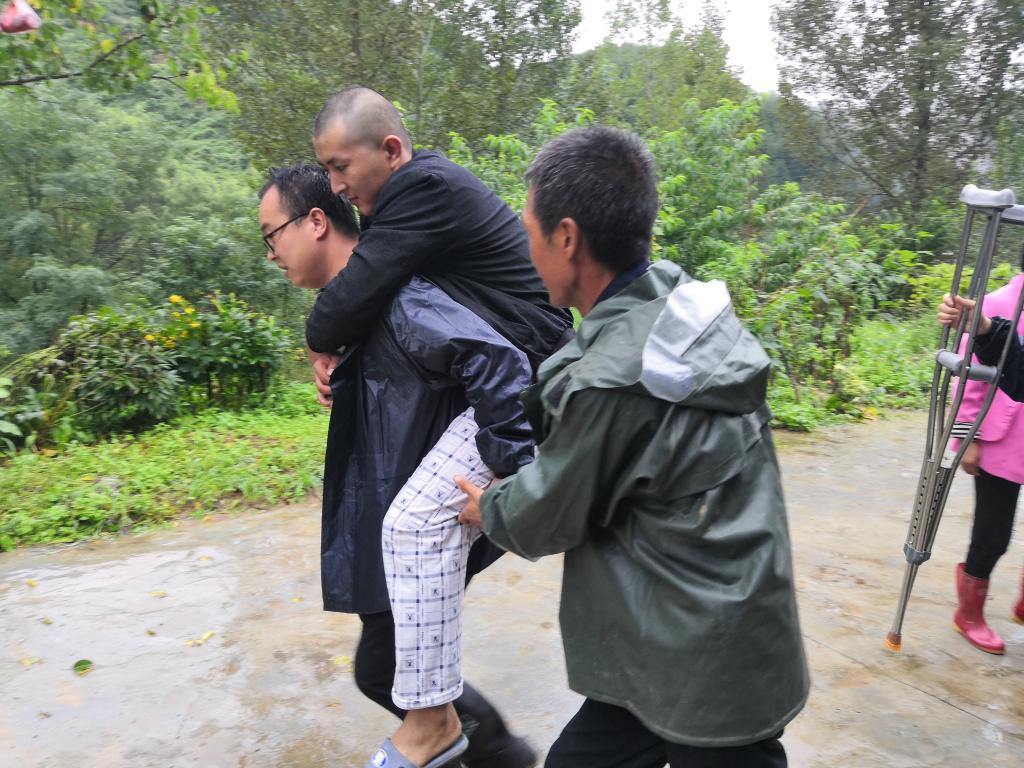 凤县平木镇纪检干部背起行动不便的群众紧急撤离灾害隐患点。