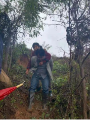 千阳县纪委监委驻高崖镇东庄村干部步行进村,为群众运送方便面、蔬菜、雨衣、雨鞋等救灾物资,转移受灾群众。