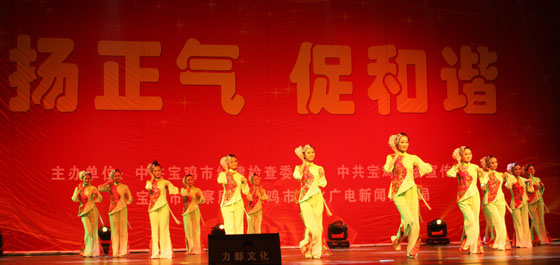10月20日下午,由中共宝鸡市纪委、宝鸡市委宣传部、市监察局、市文化广电新闻出版局联合举办的“扬正气,促和谐”宝鸡市反腐倡廉文艺演出在工人文化宫隆重举行。来自市歌舞团、市话剧团、市人民剧团和凤县旅游局等单位的演职人员为千余名机关公务人员表演了《百姓爱那清廉的官》、《红叶赞》、《反腐倡廉颂清风》等 精彩的节目。整场演出以舞蹈、快板、小品、诗朗诵等丰富多彩的形式宣传反腐倡廉、弘扬社会正气,赢得了现场观众一阵阵热烈的掌声。