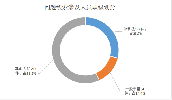 问题线索涉及人员职级划分:乡科级128件,一般干部64件,其他人员253件,分别占处置总数的28.7%、14.4%,56.9%。