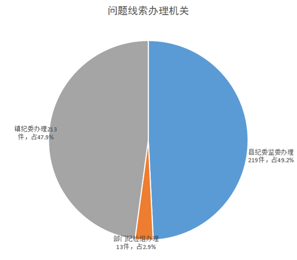 从线索办理机关看,县纪委监委办理219件,占49.2%;部门纪检组办理13件,占2.9%;乡镇纪委办理213件,占47.9%。