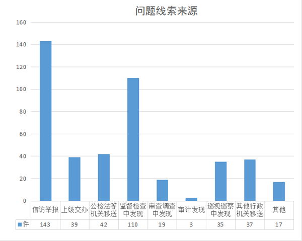 从线索来源看:信访举报143件,上级交办39件,公检法等机关移送42件,监督检查中发现110件,审查调查中发现19件,审计发现3件,巡视巡察中发现35件,其他行政执法机关移送37,其他17件。