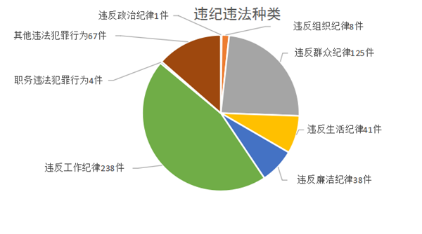 从线索种类看,违反政治纪律1件,违反组织纪律8件,违反廉洁纪律38件,违反群众纪律125件,违反工作纪律238件,违反生活纪律41件,职务违法犯罪行为4件,其他违法犯罪行为67件。