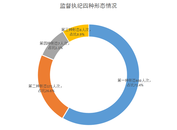 从运用监督执纪“四种形态”情况看,第一种形态460人次,占比71.4%;第二种形态171人次,占比26.6%;第三种形态6人次,占比0.9%;第四种形态7人次,占比1.1%。