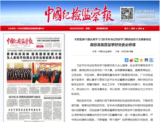 2月23日《中国纪检监察报》头版,以“高标准高质量学好党史必修课”为题报道: