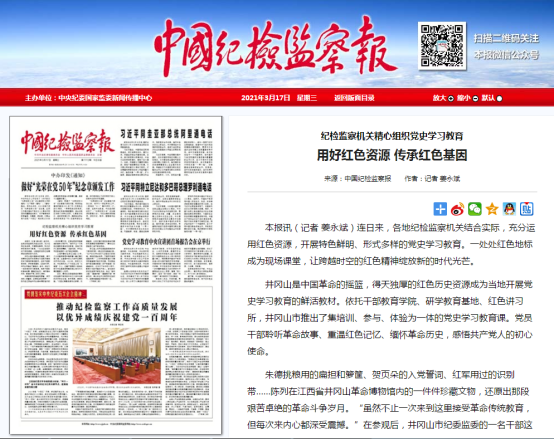 3月17日《中国纪检监察报》头版,以《用好红色资源传承红色基因》为题报道: