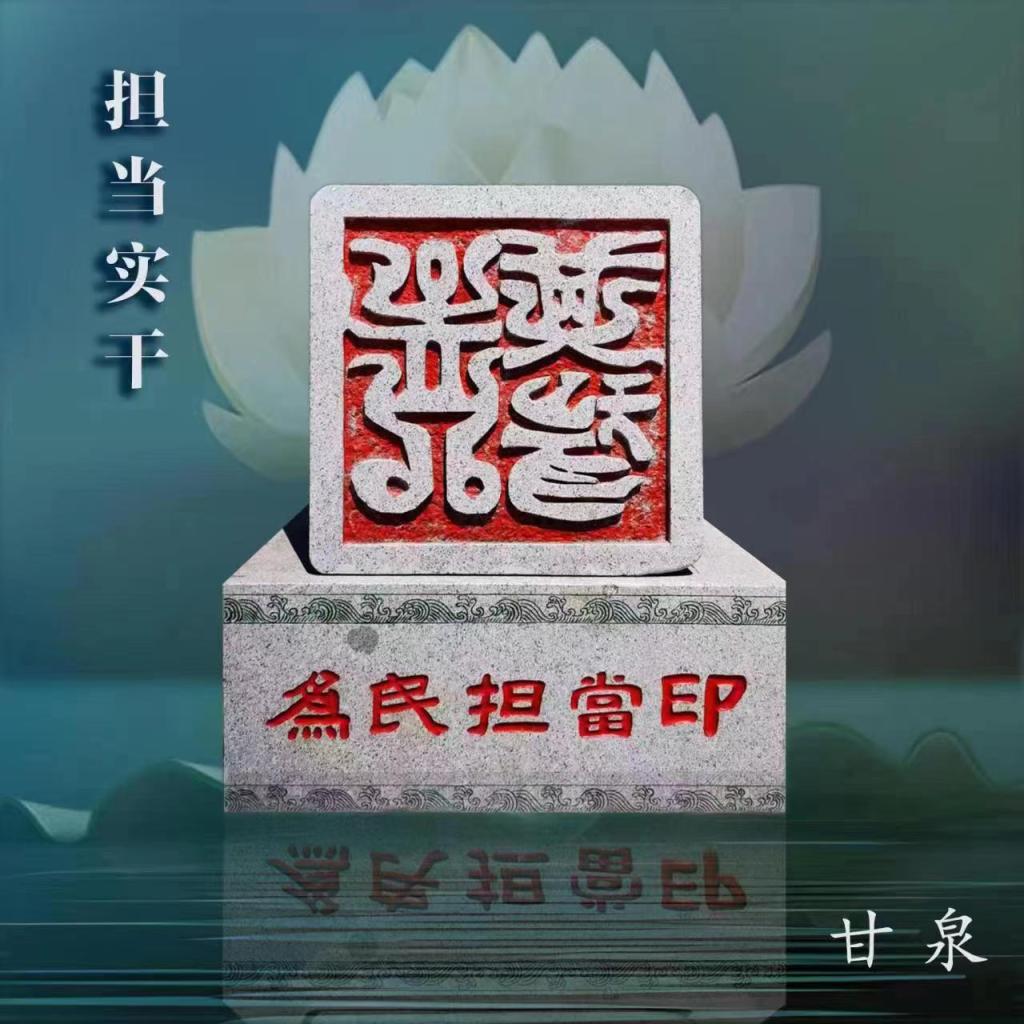 “担当实干”手机贴取材自甘泉县美水泉遗址公园“为民担当印”刻碑,深入挖掘美水县令孟其瑞主动担当实干,在目睹百姓取美水进贡朝廷之艰辛后,用其印锢泉眼的民间传说。以该印印面为主体,泉水倒影为衬托,莲花为背景,青色为主基调,向大家讲述了甘泉县省级非遗项目“美水泉的传说”故事,形象展现了“勇于担当、实干为先”的精神内涵,寓意激励广大党员干部在新时代要勇于担当、实干为先,为推动甘泉高质量发展添砖加瓦、贡献力量。