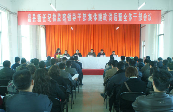 为了使新任纪检监察领导干部更好的把握纪检监察工作的特点和规律,进一步增强做好反腐倡廉工作的责任感和使命感,推动富县纪检监察工作不断取得新的成效,近日,富县对新任纪检监察领导干部进行了集体廉政谈话。县委常委、纪委书记梁建军出席了大会。会上,6名新提拔领导干部代表做了表态发言。纪委副书记、监察局局长郭文广同志就《派出纪工委、监察室工作运行管理的若干规定》进行了强调说明。县纪委副书记武清颖同志宣读《廉洁承诺书》和《2009年党风廉政建设责任制工作情况的通报》。