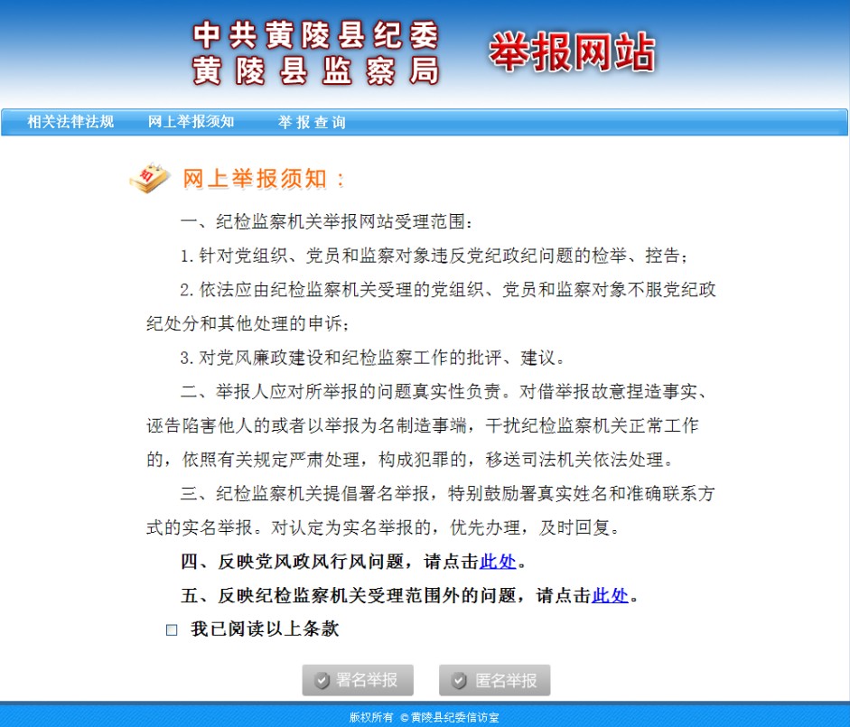 举报人进入黄陵县纪检监察网后可以直接访问新版举报网站,并按页面指引登录到相应的省、市、县信访举报页面填写举报信息。新版举报网站的开通将更好地满足人民群众网上举报新需求,更好地保障举报人的合法权益,更加方便对党员干部、行政监察对象进行监督。