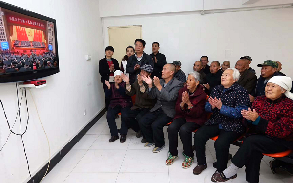 大荔县敬老院老人收看党的十九大电视直播,热议幸福美好新生活。(大荔县财政局 李世居摄)