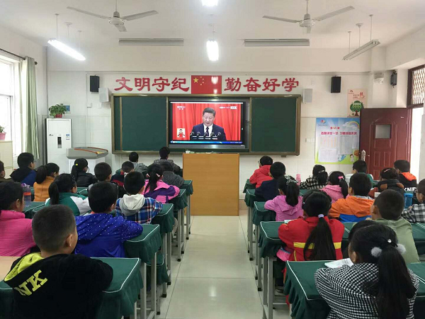 渭南市高新小学四年级二班组织小学生收看。(胡雨馨摄)