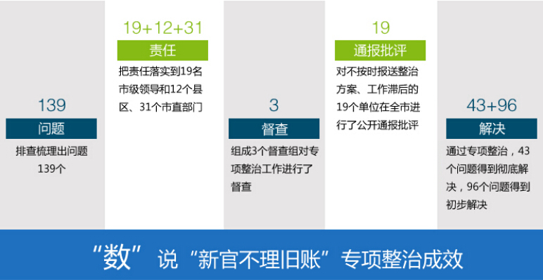 “账目”有新旧,责任无新旧。针对信访积案、政府债务和在建项目、国企改革、产业园区体制机制和薪酬、部门公用房外租管理、基层债务等方面的“新官不理旧账”问题,年初榆林市委下发《关于扎实开展“新官不理旧账”专项整治的通知》,在全市开展“新官不理旧账”专项整治,以此作为推动工作、落实责任的抓手。通过专项整治,43个问题得到彻底解决,96个问题得到初步解决。
