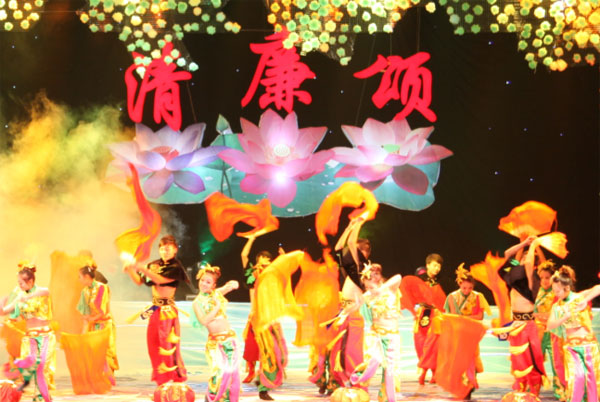 短短100分钟,精美的舞台设计,专业的灯光音响,动情感人的演出,让观众在享受艺术魅力的同时净化了心灵。晚会筹备历时半年,凝聚了全市各级各部门领导、编创和演职人员的心血与汗水。榆林市委常委、市纪委书记周树红多次召开专题会议研究部署和组织协调。表演唱《胡总书记来榆林》就是由他作词并指导编排的。参加汇演的15个节目都是在各县区、各系统自下而上举办廉政晚会的基础上,精心挑选的。省纪委反腐倡廉文艺节目汇演评审组对晚会给予了高度评价:“榆林的清廉颂文艺晚会主题突出、特色鲜明、取材真实、催人奋进,集艺术性,思想性,教育性于一体。”市纪委的同志告诉笔者,举办反腐倡廉文艺晚会,就是要使反腐倡廉宣传教育从枯燥的文件传达和会议宣讲转变为活泼、生动、带有浓厚文化氛围的舞台效应,在优美的歌舞中演绎主题,以这种喜闻乐见的方式达到教育干部的目的。