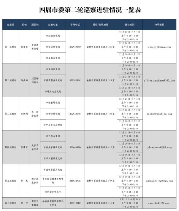 本轮市委将派出6个巡察组,分别对市政府办、市信访局、榆林能源集团等16个市直部门、企业开展巡察。此次巡察采取“一对一”和“一托三”的方式开展,巡察时间为期一个半月。