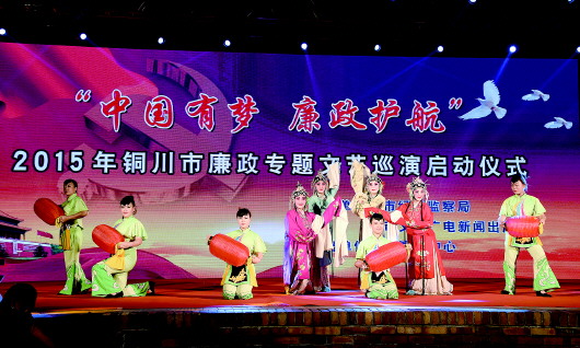 7月16日晚,由铜川市纪委监察局、市文广局主办的“中国有梦 廉政护航”2015年铜川市廉政专题文艺巡演活动在新区阳光大舞台启动。市委书记郭大为,市政协主席张应龙,市人大常委会党组书记、副主任袁丁兴,市委常委、市委宣传部部长闫旭,市委常委、市纪委书记王瑞峰,市委常委、常务副市长相红霞等与近千名干部群众一起观看演出。