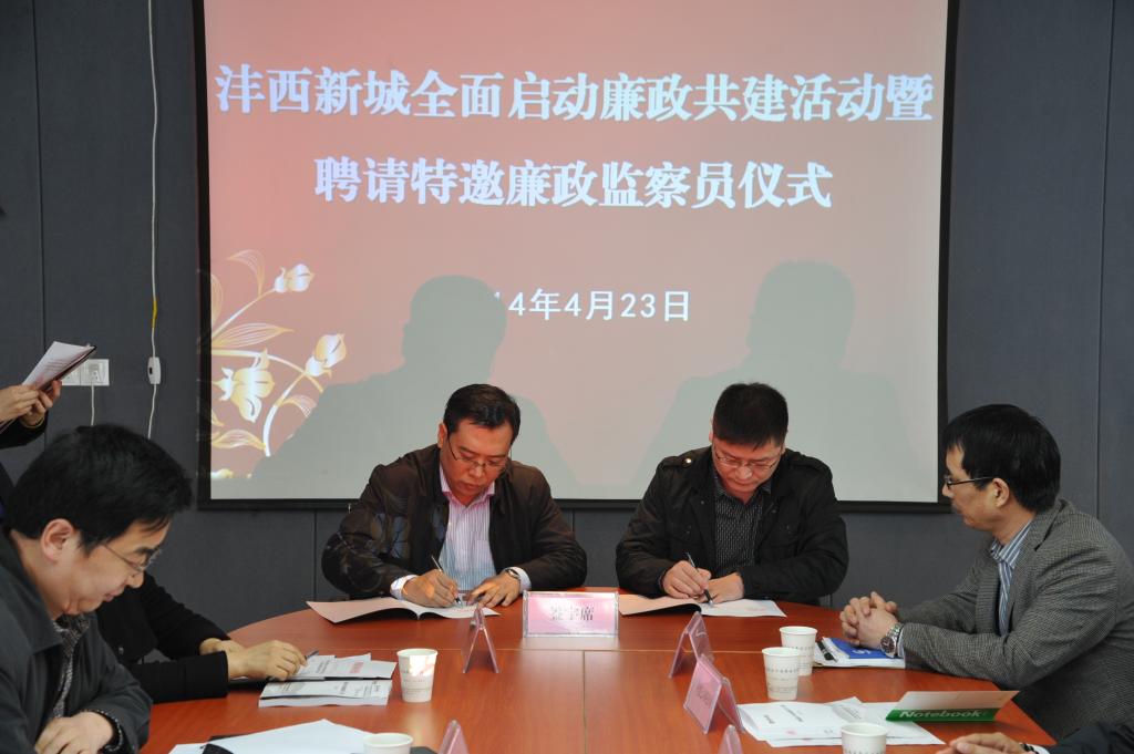 会上,沣西新城纪委与中铁港航局等10家参建单位纪(工)委签订《沣西新城廉政共建协议书》,并授予参建单位“沣西新城廉政共建单位”,向10名特邀廉政监察员颁发聘书。
