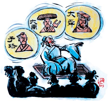 《孟子·公孙丑》中有这样一段文字,孟子在对他的弟子们谈到从政者要勇于接受批评时,举出历史上的三位名人:子路、禹和舜:“子路,人告之以有过则喜。禹,闻善言则拜。大舜有大焉,善与人同,舍己从人,乐取于人以为善。自耕稼、陶、渔以至为帝,无非取于人者。取诸人以为善,是与人为善者也。故君子莫大乎与人为善。”
