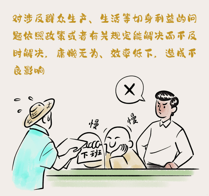 (一)对涉及群众生产、生活等切身利益的问题依照政策或者有关规定能解决而不及时解决,庸懒无为、效率低下,造成不良影响;