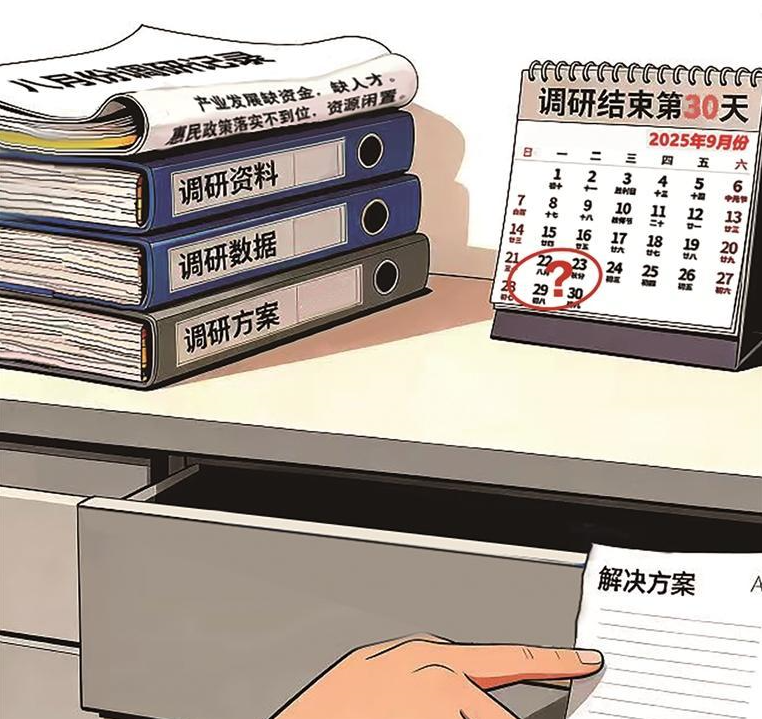 调研不仅是我们党的传家宝,还是破解基层“急难愁盼”的关键抓手。然而现实中,一些上级机关下基层调研时,虽直奔现场、直击问题,记满数据、收录材料,但返回后却迟迟不研究、不解决,最终让这些材料沦为归档的“沉睡文件”。这种“调而不研”的作风,正是形式主义与官僚主义的隐形注脚。一方面,重“走过场”的形式、轻“解难题”的实效,让问题始终停留在“被记录”层面;另一方面,将“带回材料”等同于“完成任务”,不愿花精力深研细究、推动解决,本质是对群众利益的漠视。破局需出实招。当以一抓到底的韧劲推进调研、细化调研制度,明确“谁调研、谁解决”的职责,规定问题处置时限。同时,以群众满意为标尺,增设调研反馈机制,用群众的真实评价检验调研成效。 李小军作