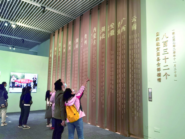 带着泥土和花朵芬芳气息的作品,让沉浸在展览中的观众为之感动、共情。展览尾声部分,设计了832个脱贫县的竹简造型墙,这里没有过多的色彩,只有一个个朴素的地名和青史永存的一句话:“832个国家级贫困县全部摘帽”。许多观众在这里驻足良久,有人细细寻找,有人轻声说着“这里有我的家乡”。