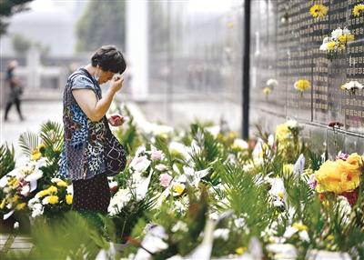 7月28日,市民在唐山地震遗址纪念公园的纪念墙前哀悼。 新华社发(赵亮 摄)