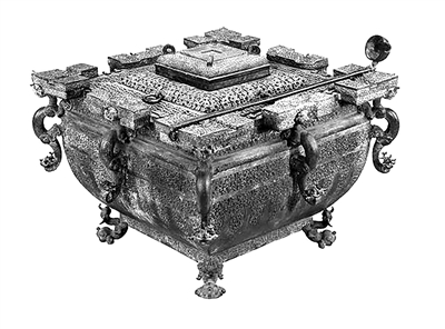 直接咀嚼冰有些乏味,冰镇食物显然更有滋味。湖北省博物馆曾侯乙展厅中,观众络绎不绝。曾侯乙墓中出土宝物众多,其中有一件铜鉴缶,距今有两千四百多年。这件铜鉴缶,我们可以认为是古人的“冰箱”,它由方鉴、方缶两部分组成,缶在鉴内,缶与鉴通过三个套钩和一个小孔进行连接,缶中置酒,在缶与鉴的间隙中放冰,这样就可以喝到冰镇酒了。到了冬天,在间隙中放温热的水,也有温酒的功能了。这件铜鉴缶的装饰很精致,满绘蟠螭纹等纹饰,底部四角各有一抬头张口的小怪兽,器身有八个龙形耳钮,还附有一个长柄勺子,具有浓郁的楚文化特色。