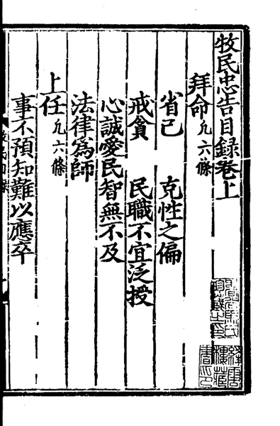 张养浩《牧民忠告》书影,其中“戒贪”条体现了他的廉洁思想。 (资料图片)