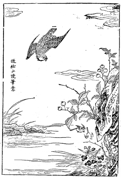 《唐诗画谱》中描绘了钱起一首《江行》的画面,诗曰:“秋寒鹰隼健,逐雀下云空。知是江湖阔,无心击塞鸿。”资料图片