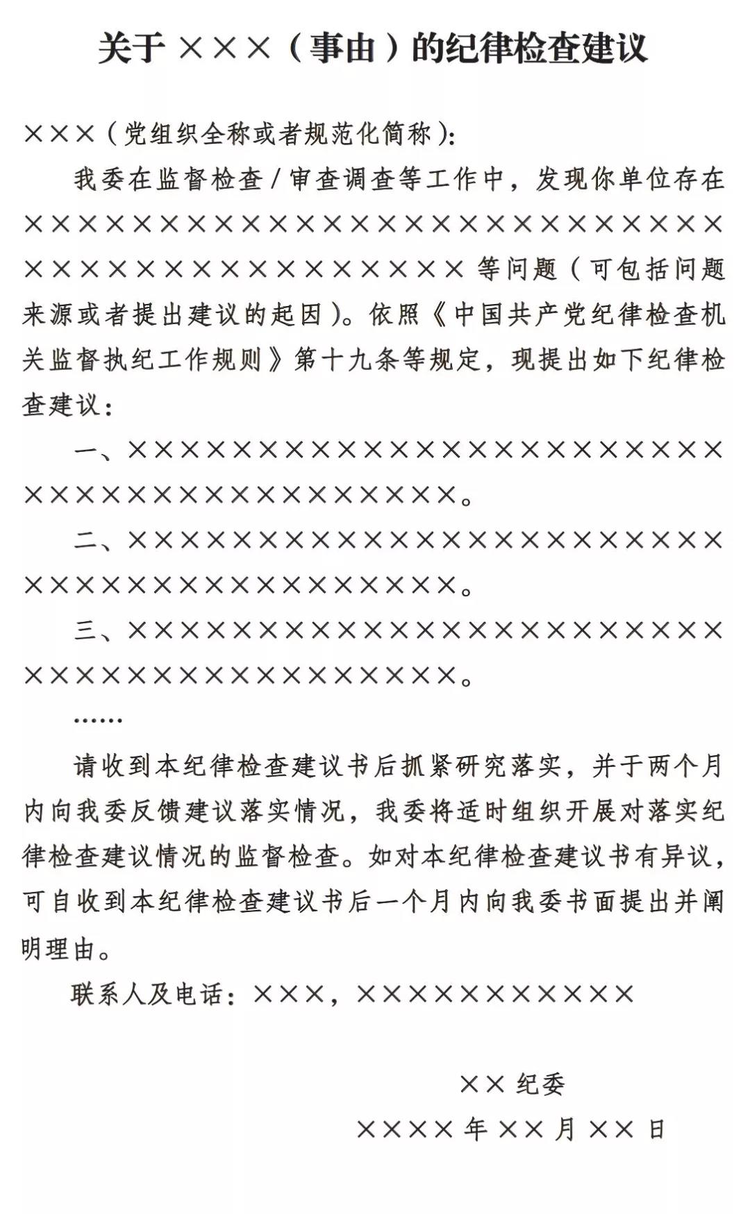 本文书系依照《中国共产党纪律检查机关监督执纪工作规则》第十九条等规定制作。纪检监察机关承办部门对监督中发现的突出问题,认为应当向有关党组织提出纪律检查建议的,可起草本文书并按程序报批。