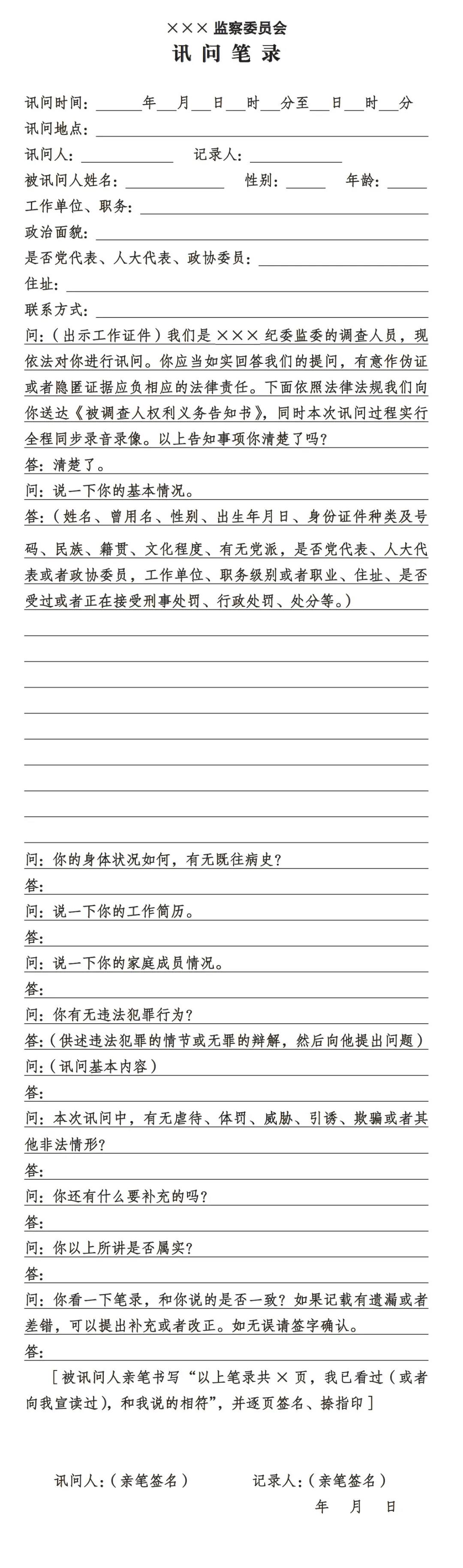 本文书系依照《中华人民共和国监察法》第二十条第二款规定制作。监察机关调查人员对被调查人进行讯问时,应当现场制作本文书。