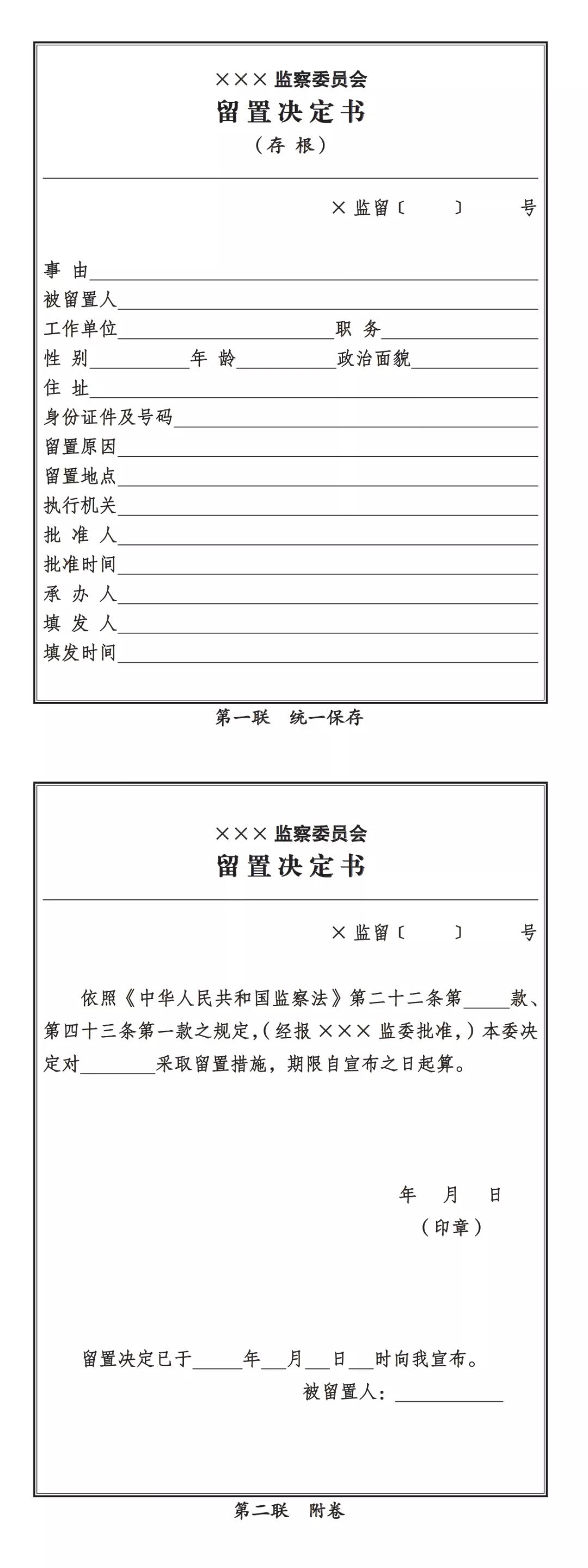 四是对被调查人采取留置措施的,本文书第二联法律依据部分写为“《中华人民共和国监察法》第二十二条第一款、第四十三条第一款”。