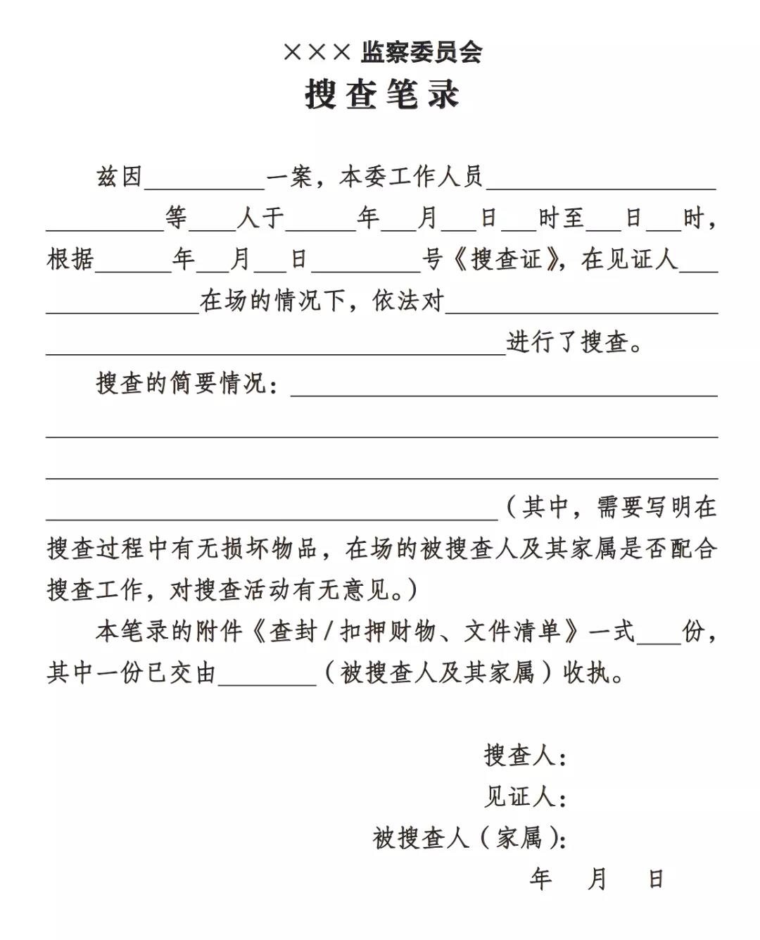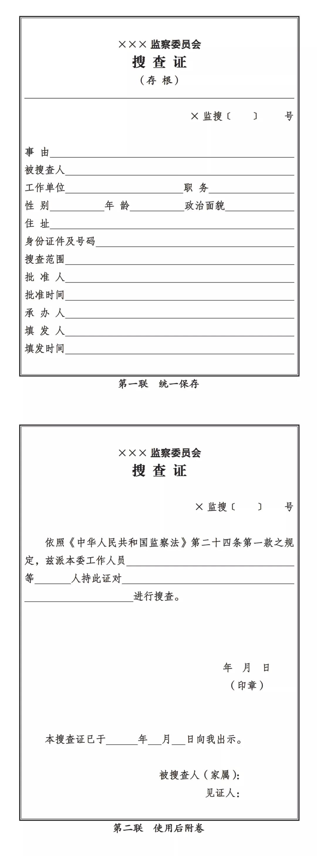 本文书系依照《中华人民共和国监察法》第二十四条第一款规定制作,为监察机关对被调查人以及可能隐藏被调查人或犯罪证据的人的身体、物品、工作地点、住处、银行保管箱和其他有关地方进行搜查时使用。二、制作程序监察机关对被调查人以及可能隐藏被调查人或犯罪证据的人的身体、物品、工作地点、住处、银行保管箱和其他有关地方进行搜查时,应当根据被搜查人的具体身份,依照相关规定,按程序报批后制作本文书。其中,需要对同级党委管理的正职领导干部采取搜查措施的,应当按程序报同级党委主要负责人审批;需要对同级党委管理的副职领导干部采取搜查措施的,应当按程序报同级纪检监察机关主要负责人审批;需要对同级党委管理的正职、副职领导干部以外的人员采取搜查措施的,应当按程序报同级纪检监察机关分管领导审批。三、注意事项一是本文书以搜查次数为单位制作。二是本文书第一联中“批准人”填写审批决定采取搜查措施的领导同志姓名;“批准时间”填写领导同志审批决定采取搜查措施的日期;“承办人”填写负责具体实施搜查措施的工作人员姓名;“填发人”填写负责制发文书的工作人员姓名;“填发时间”填写制发文书的日期。三是本文书第二联中落款日期填写领导同志审批决定采取搜查措施的日期,同第一联中“批准时间”一致。四是进行搜查时,应当向被搜查人或者其家属等见证人出示搜查证,并由被搜查人或者其家属等见证人签名或者盖章。如果被搜查人或者其家属不在场,或拒绝签名、盖章的,应当在本文书第二联上记明。五是采取搜查措施时,由于客观原因无法由符合条件的人员担任见证人见证的,监察机关可以采取搜查措施,但必须全程进行同步录音录像,留存备查,同时由监察机关调查人员在搜查笔录上记明搜查时没有见证人在场见证的情况。