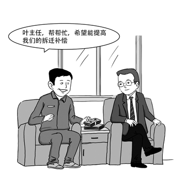 2013年5月,江苏省南京市浦口区对滨江风光带浦口新城段建设项目实施搬迁,时任区拆迁管理中心副主任的叶某对口负责。某货运公司法定代表人花某某通过叶某的老领导(另案处理)找到他,希望能够提高拆迁补偿。叶某先后接受花某某3箱白酒及2万元现金,答应为其“想想办法”。