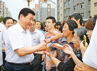 7月11日至12日,中共中央总书记、国家主席、中央军委主席习近平在河北省调研指导党的群众路线教育实践活动。这是习近平看望正定县塔元庄村村民并同他们亲切握手。