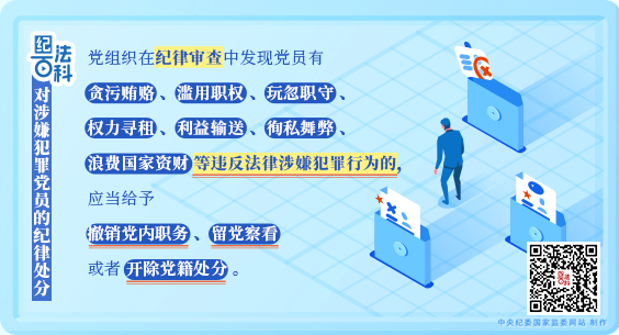 第二十九条规定,党组织在纪律审查中发现党员有贪污贿赂、滥用职权、玩忽职守、权力寻租、利益输送、徇私舞弊、浪费国家资财等违反法律涉嫌犯罪行为的,应当给予撤销党内职务、留党察看或者开除党籍处分。
