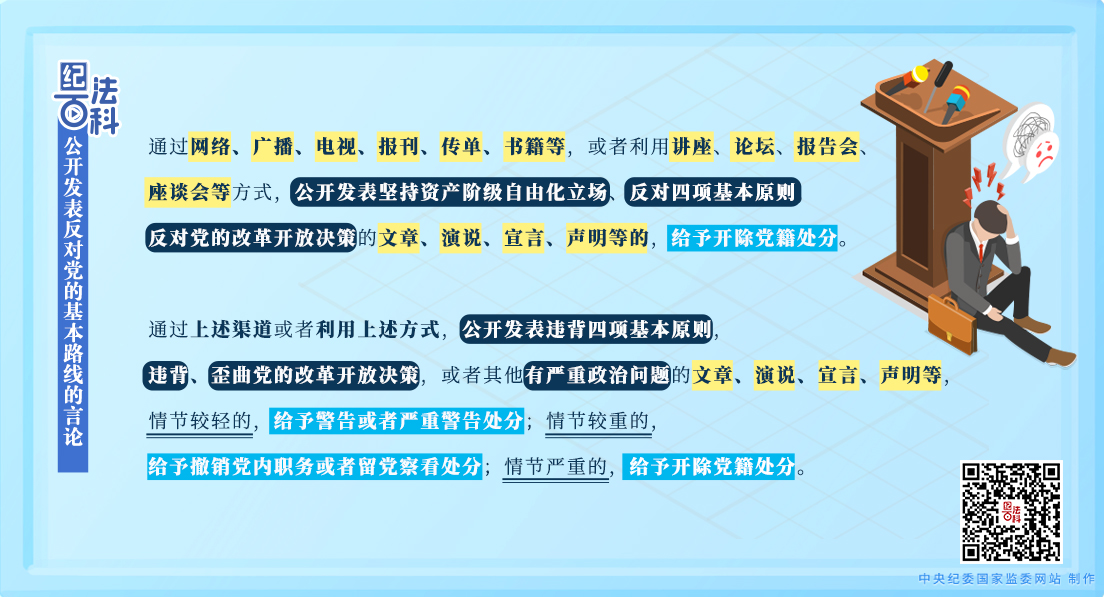 《中国共产党纪律处分条例》第五十条第一款规定,通过网络、广播、电视、报刊、传单、书籍等,或者利用讲座、论坛、报告会、座谈会等方式,公开发表坚持资产阶级自由化立场、反对四项基本原则,反对党的改革开放决策的文章、演说、宣言、声明等的,给予开除党籍处分。第五十一条第一款第一项规定,通过上述渠道或者利用上述方式,公开发表违背四项基本原则,违背、歪曲党的改革开放决策,或者其他有严重政治问题的文章、演说、宣言、声明等,视情节轻重给予警告直至开除党籍处分。