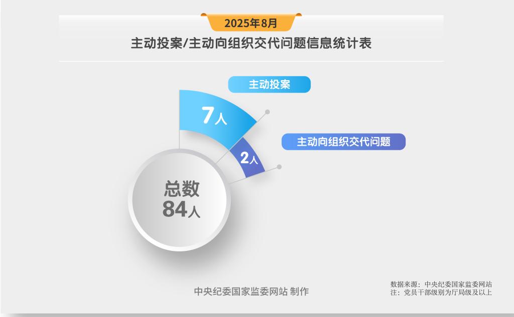 2025年8月,中央纪委国家监委网站发布的审查调查信息中,7名党员领导干部主动投案,2名党员领导干部主动向组织交代问题。