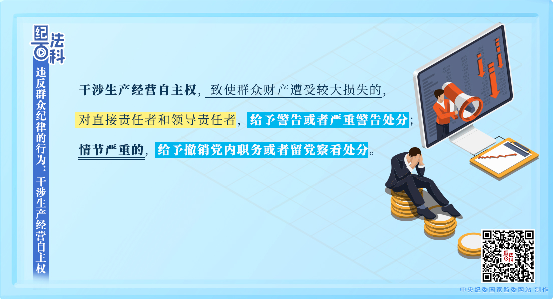 《中国共产党纪律处分条例》第一百二十三条规定,干涉生产经营自主权,致使群众财产遭受较大损失的,对直接责任者和领导责任者,给予警告或者严重警告处分;情节严重的,给予撤销党内职务或者留党察看处分。