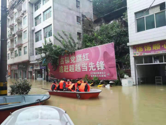 别怕,我们来了!蜀河镇街道一片汪洋,镇纪委干部和镇政府干部划着冲锋舟挨家挨户排查是否还有群众没有安全转移。